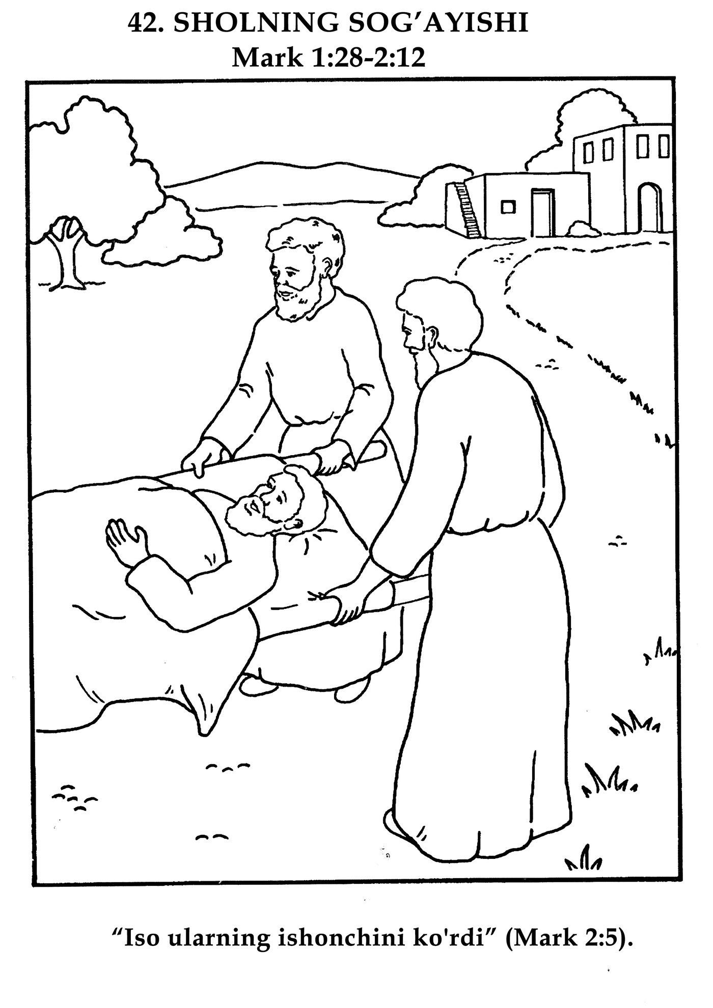 Shu kuni to'rt do'st bemorni to'shakda Isoning oldiga olib kelishdi. Ammo ular Isoga yaqinlasha olmadilar. Shunday qilib, ular g'ayrioddiy yo’l tutishdi. Ular bemorni tomga ko'tarishdi, tomda teshik ochib va bemorni to'shakda pastga, Iso tomon tushira boshladilar.
